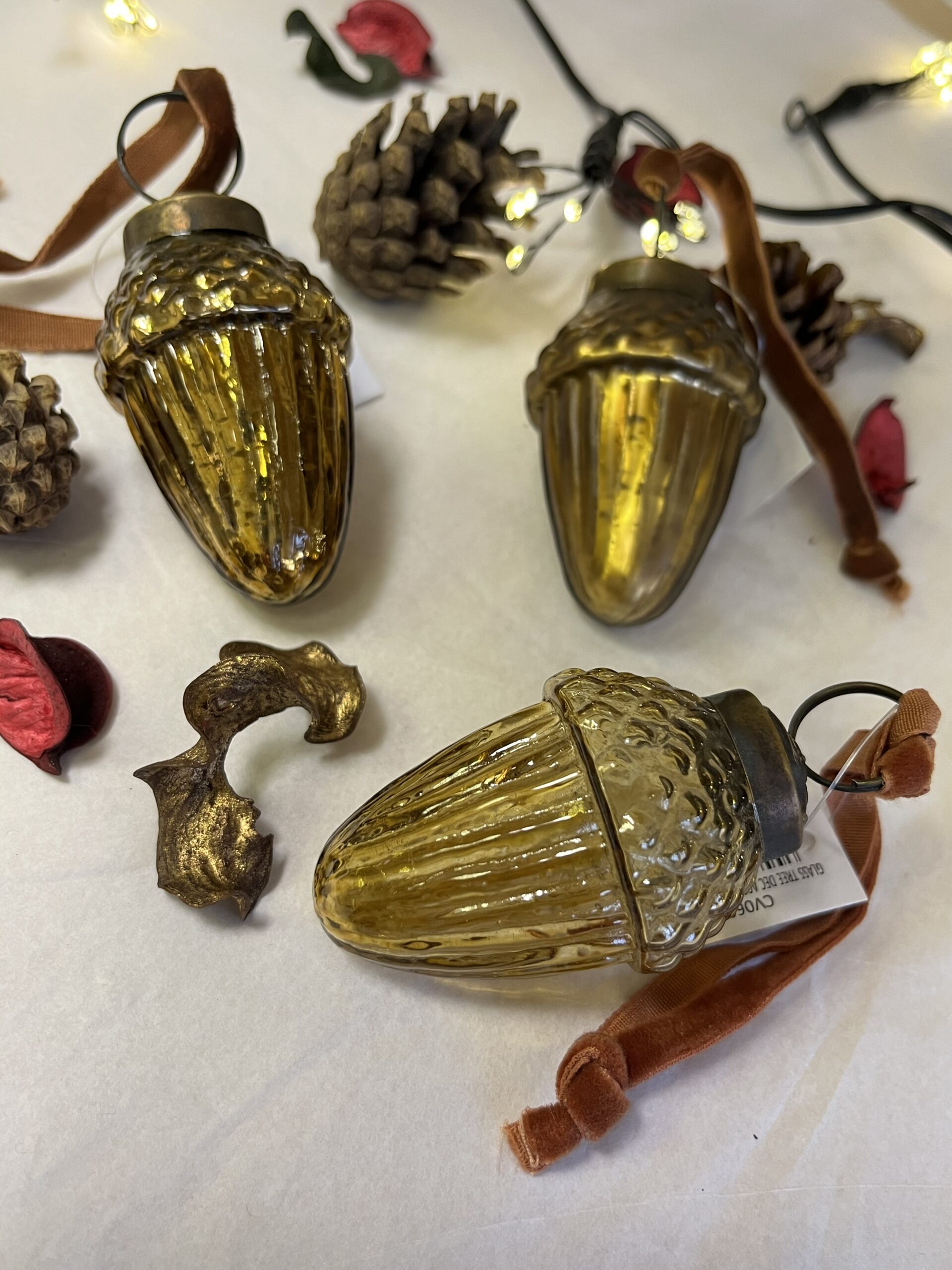 These vintage acorn shaped glass baubles are a stunning item to achieve that rustic feel, they come with a velvet ribbon in dark brown colour which perfectly complements their colour colour.